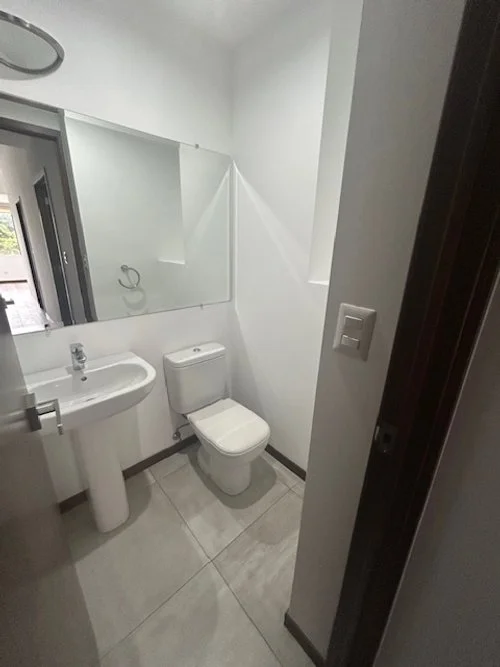 Baño de visitas. Sala familiar, 3 dormitorios, 2 baños.