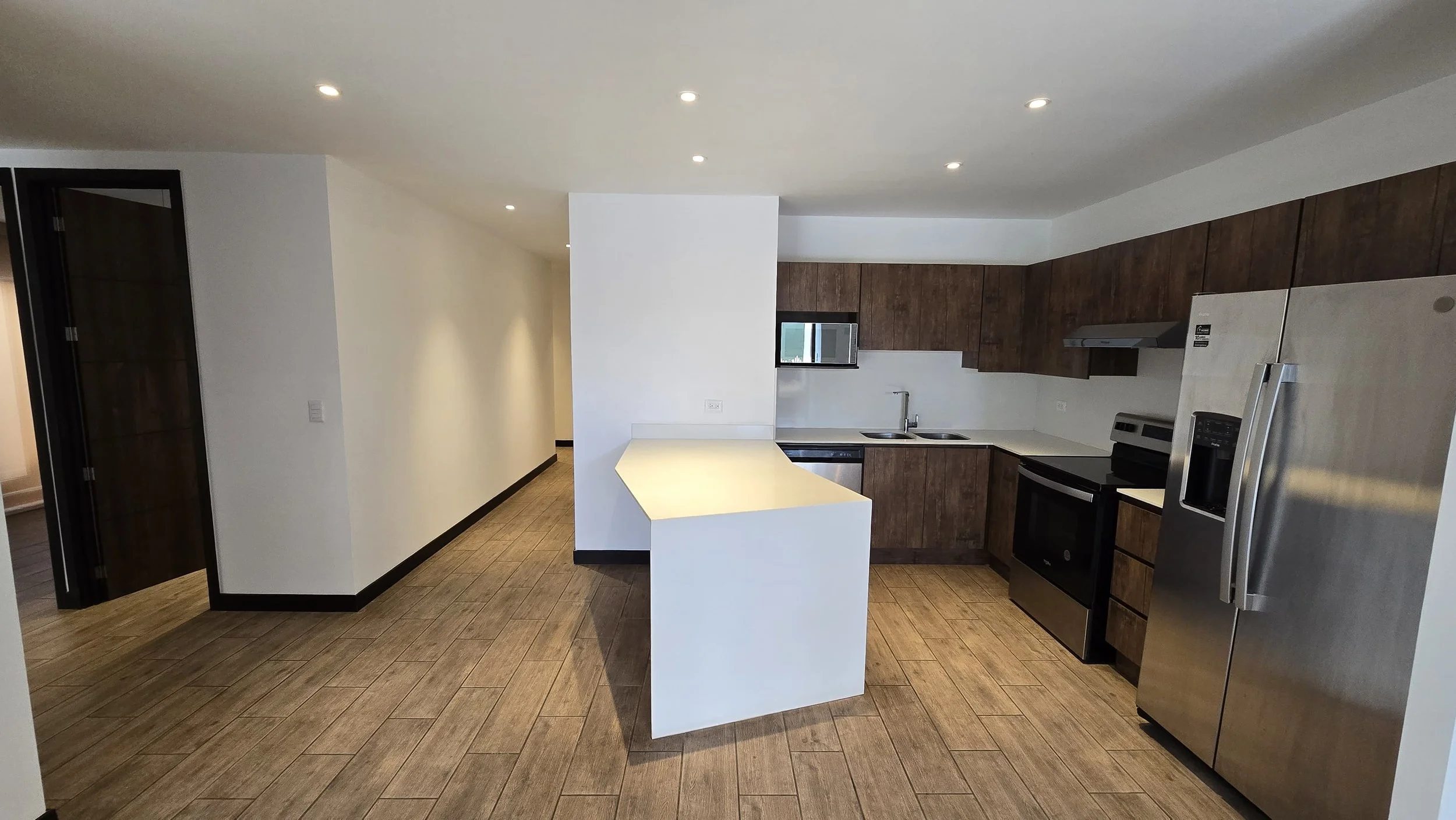 - Equipamiento: refrigeradora, horno, estufa, microondas, campana extractora, lavavajillas, calentador de agua, torre de lavado y secado.
