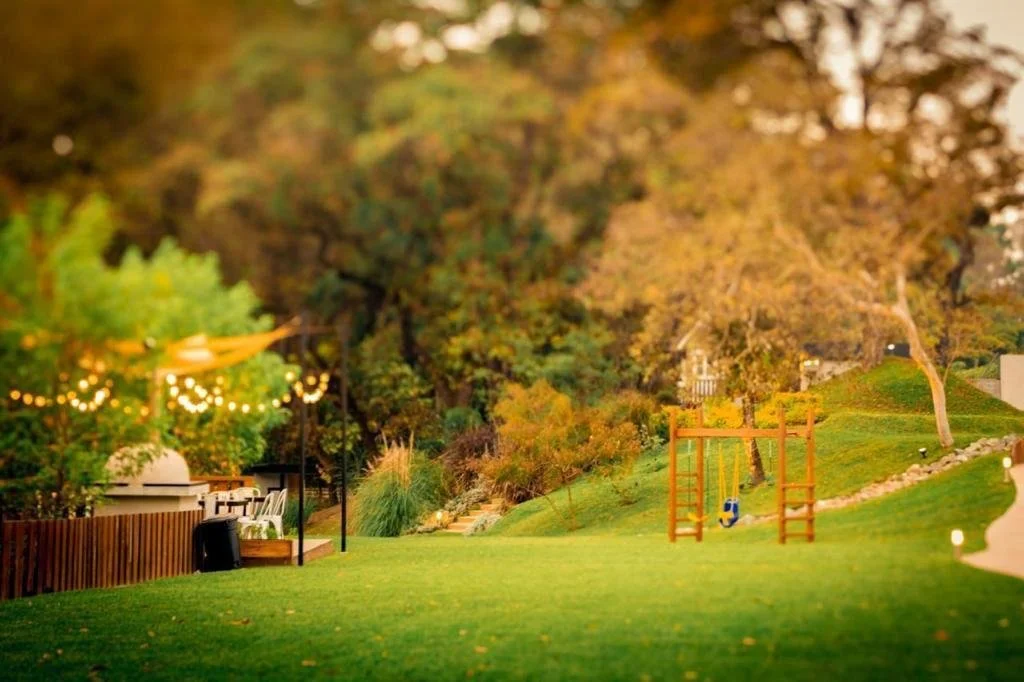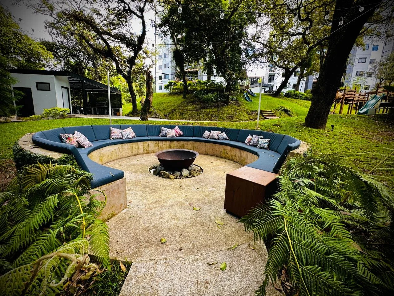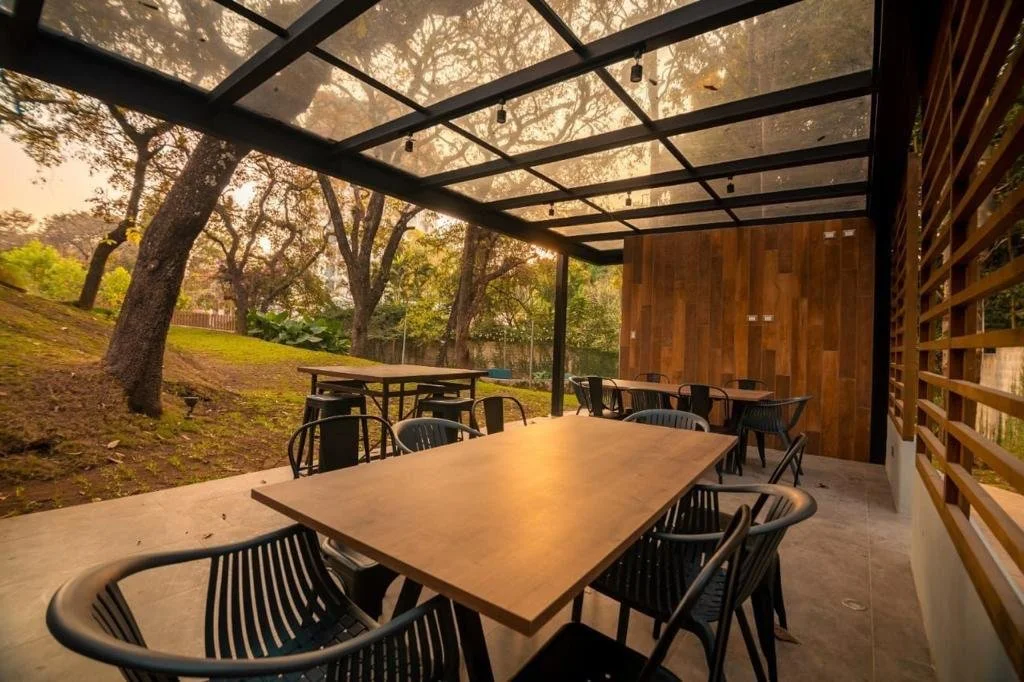 1) 3 espacios para comer en el área verde, dos al aire libre y uno bajo techo. Dos con churrasquera y una con horno de pizza.